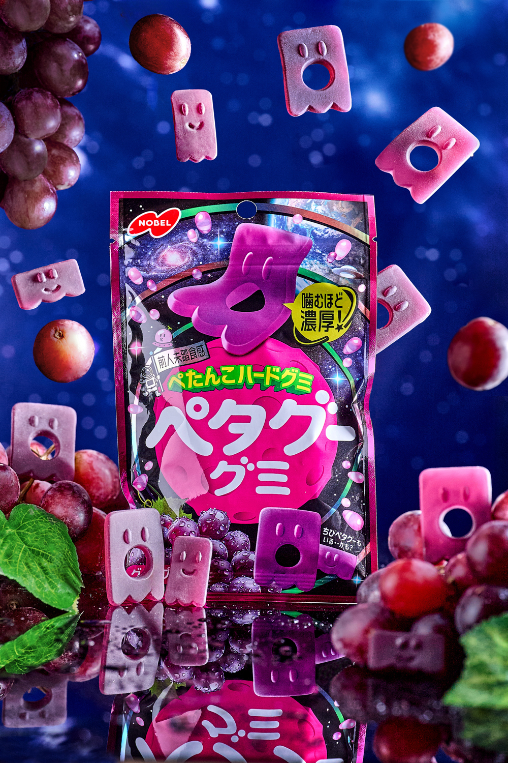 パッケージデザインは、「ペタグーグミ」の世界観である「宇宙」のテイストをより濃く反映した「ペタグーグミ」ならではのユーモアを感じていただけるデザインに刷新し、味わいについては、「ひと噛み目から感じられる濃厚さ」を追求し、グレープ味の噛むほどに芳醇な香りと甘みが広がり、つい手が伸びてしまうようなおいしさに仕上げています。