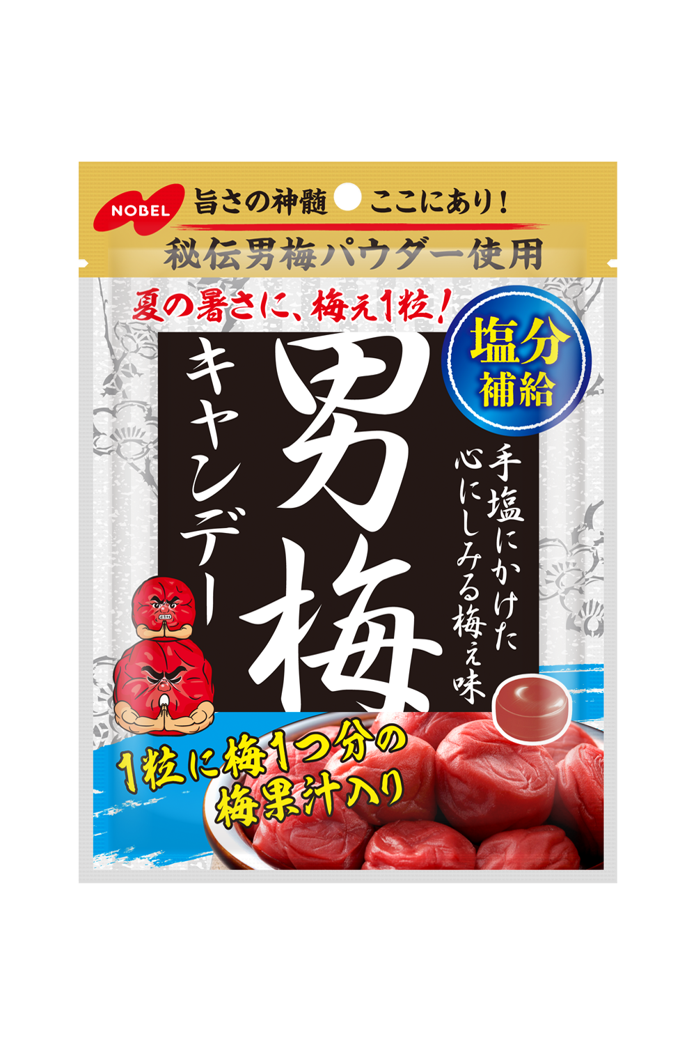 「男梅キャンデー」は、2007年の発売以来、塩味・酸味・旨味・甘味のバランスにこだわり、梅ぼし本来の美味しさを追求した商品で、特に“秘伝男梅パウダー”を使用した濃厚な梅ぼしの味わいが多くのお客様に親しまれているノーベル製菓のロングセラー商品です。