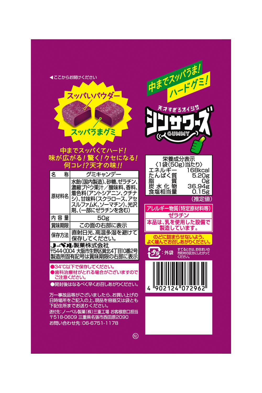 - ハードな弾力食感はそのままに、酸味強化で味全体を底上げ、数段美味しくなったグレープ味が楽しめるハードグミ。