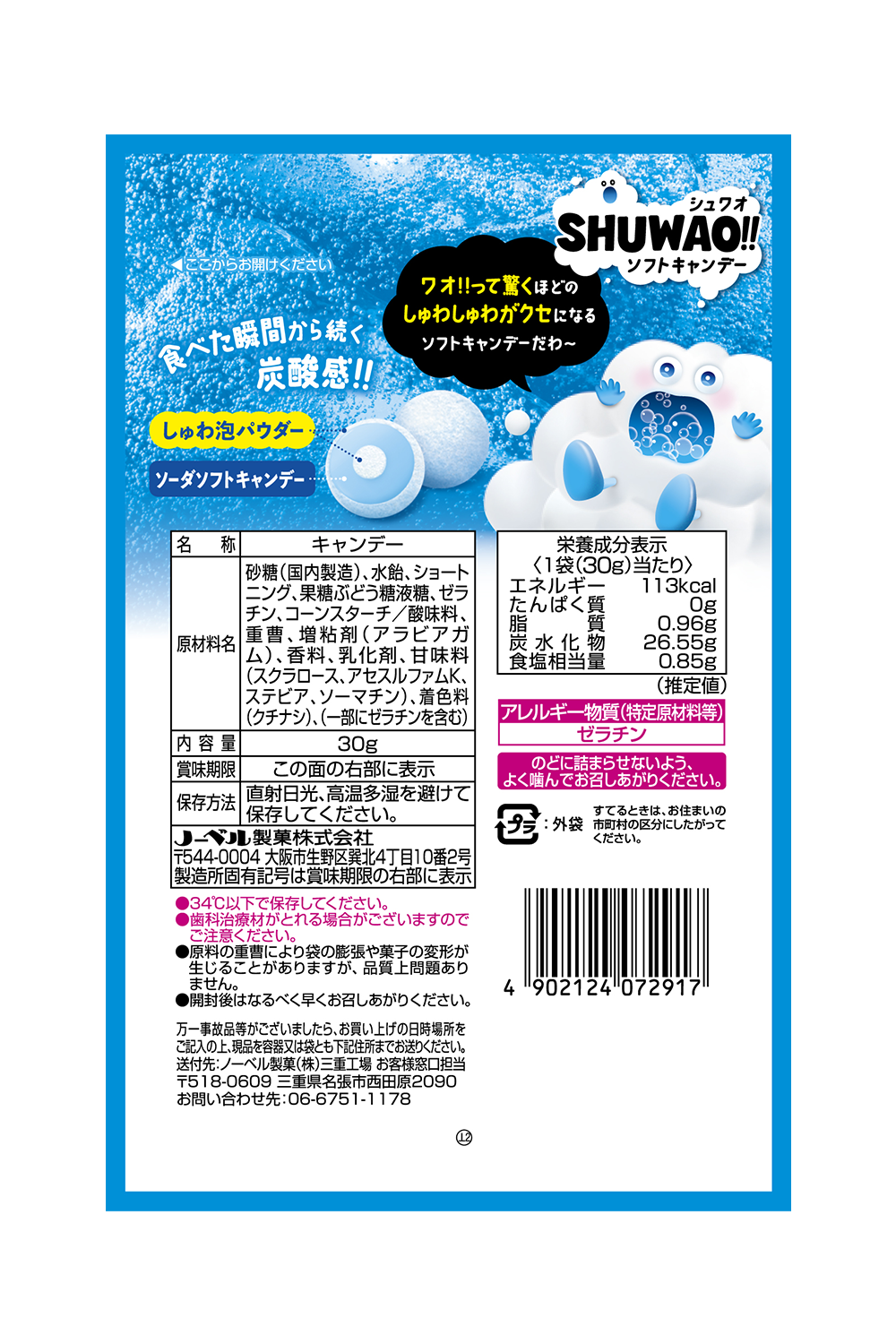 - コーティングとセンターに発泡パウダーを使用することで、強い発泡感が最初から最後まで長く楽しめるソフトキャンデー。外装サイズアップによる、商品特徴の伝わりやすさ。