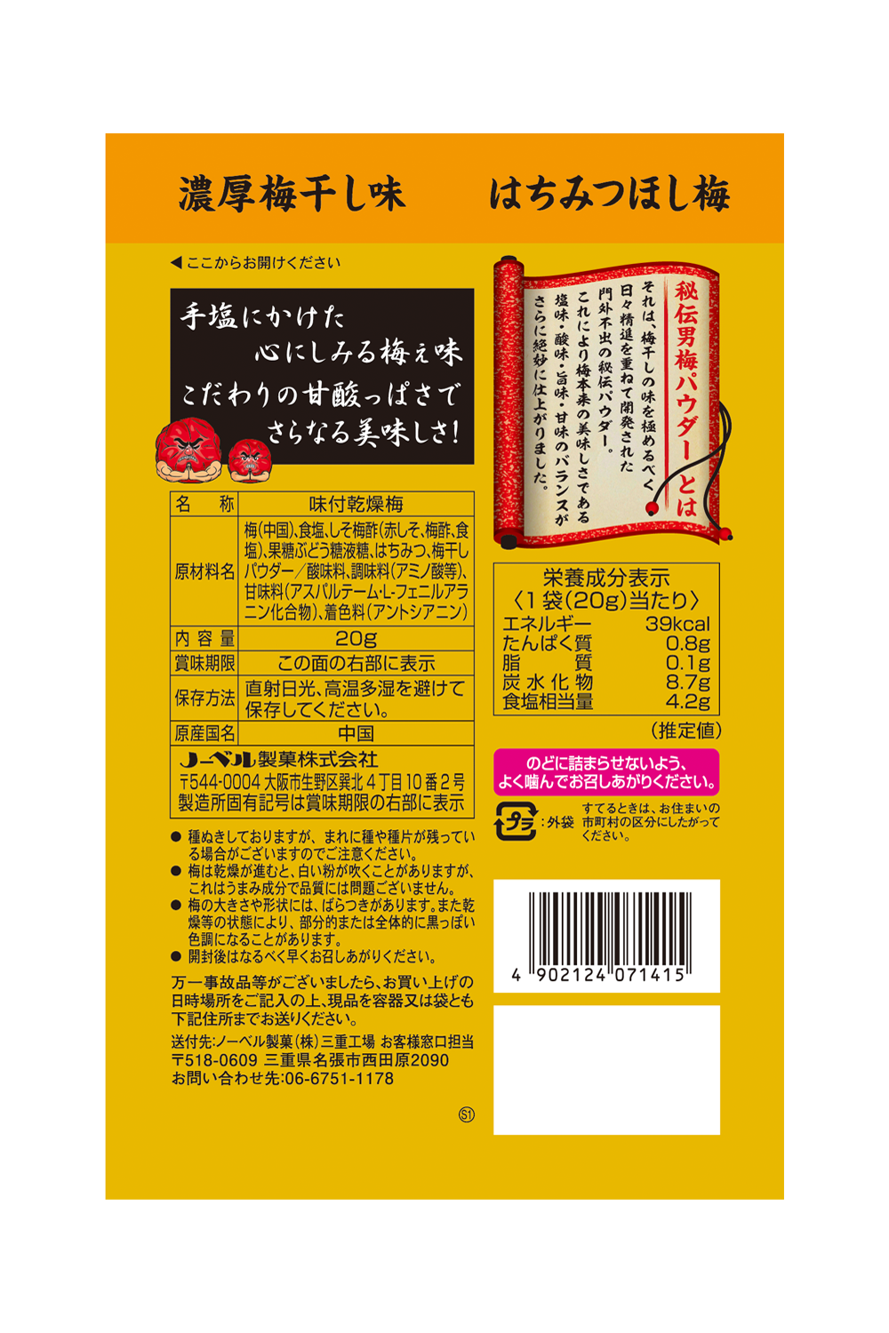 - 超濃厚な梅の旨味に甘酸っぱさが加わったはちみつ男梅ほし梅が男梅ブランドのコンセプトをより伝わりやすく表現したデザインにリニューアル。