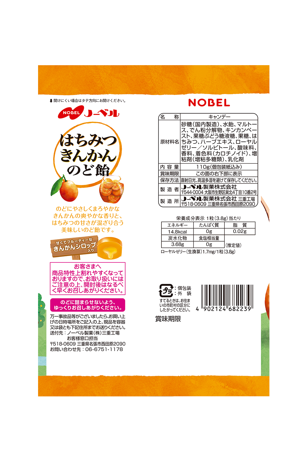 砂糖(国内製造)、水飴、マルトース、でん粉分解物、キンカンペースト、果糖ぶどう糖液糖、果糖、はちみつ、ハーブエキス、ローヤルゼリー/ソルビトール、酸味料、香料、着色料(カロチノイド)、増粘剤(増粘多糖類)、乳化剤