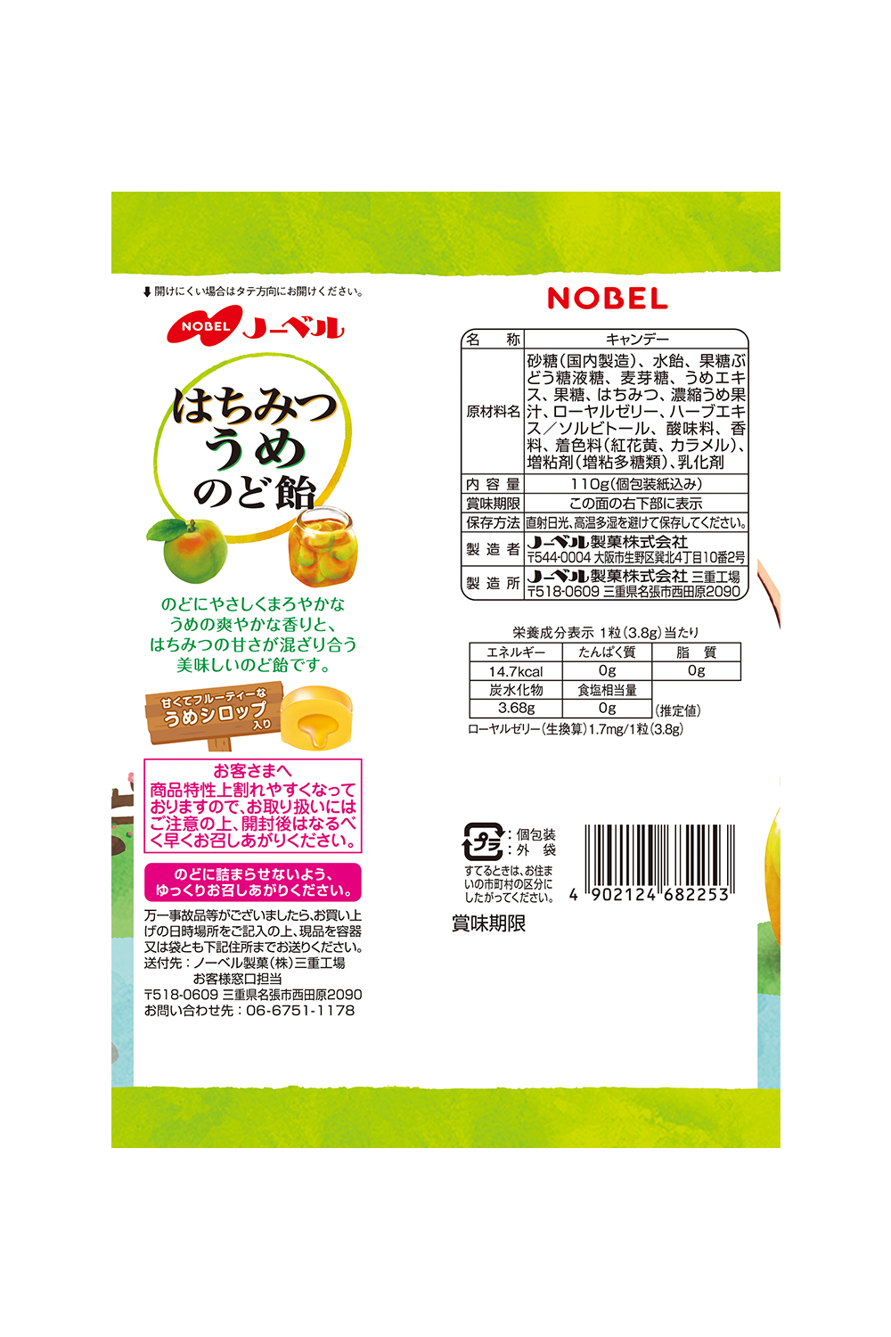 砂糖(国内製造)、水飴、果糖ぶどう糖液糖、麦芽糖、うめエキス、果糖、はちみつ、濃縮うめ果汁、ローヤルゼリー、ハーブエキス/ソルビトール、酸味料、香料、着色料(紅花黄、カラメル)、増粘剤(増粘多糖類)、乳化剤