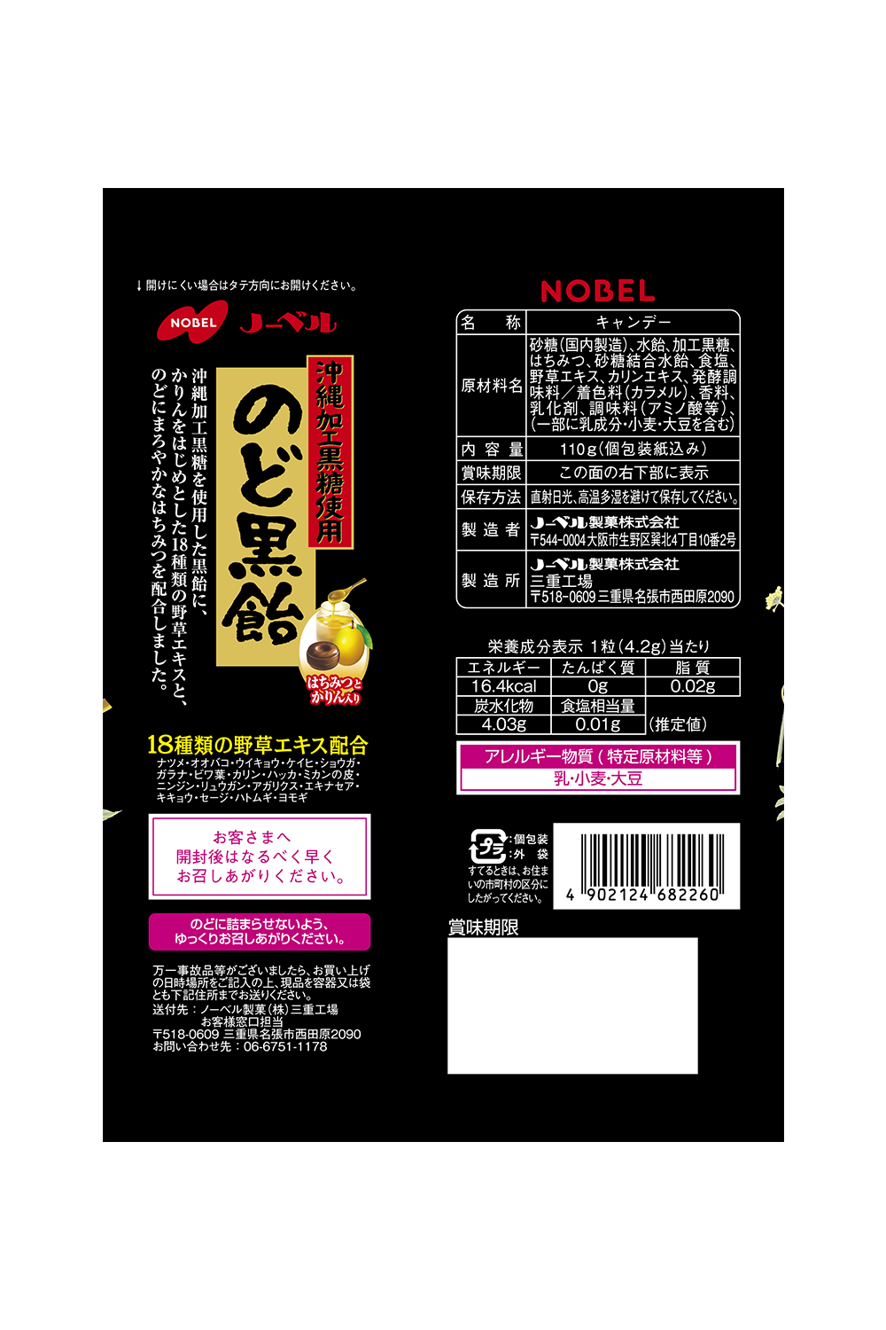 砂糖(国内製造)、水飴、加工黒糖、はちみつ、砂糖結合水飴、食塩、野草エキス、カリンエキス、発酵調味料/着色料(カラメル)、香料、乳化剤、調味料(アミノ酸等)、(一部に乳成分・小麦・大豆を含む)