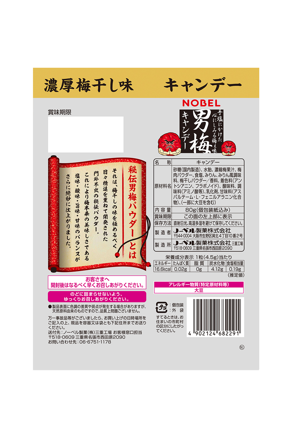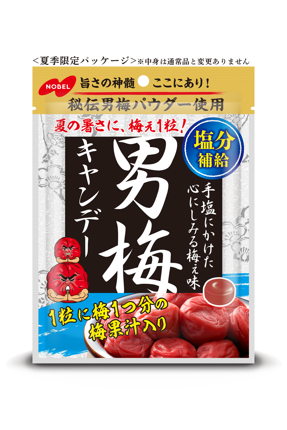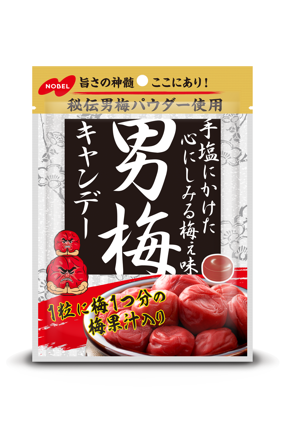 - 秘伝男梅パウダーを使用し、梅本来の美味しさである塩味・酸味・旨味・甘味のバランスが絶妙なキャンデー。