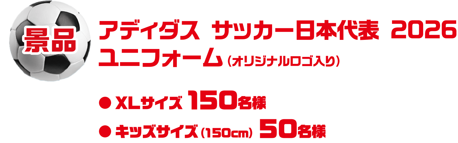 - ・景品の付与は、アディダス サッカー日本代表 2026 ユニフォーム(オリジナルロゴ入り)、アディダス サッカー日本代表 2026 ユニフォームKids(オリジナルロゴ入り)それぞれお一人様(お手持ちの端末1台につき)1回に限らせていただきます。