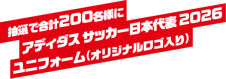 期間中に対象商品を購入したレシートの画像をキャンペーンサイト上にアップロードして応募すると、アディダス サッカー日本代表 2026 ユニフォーム(オリジナルロゴ入り)、またはアディダス サッカー日本代表 2026 ユニフォームKids(オリジナルロゴ入り)が当たります。