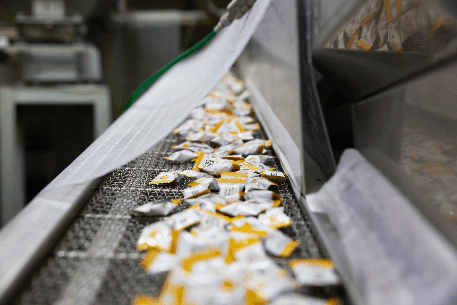包装機に飴を供給し、1粒ずつ個包装していきます。